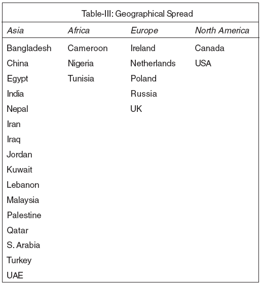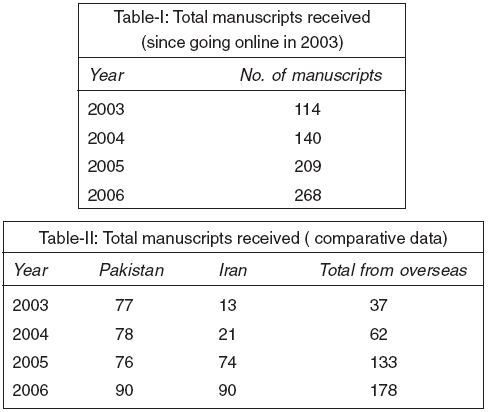 The number of countries from where the manuscripts have been received has steadily increased from 11 in 2003 to 30 in 2006 and geographical spread has also increased to four continents, the major share being that of Asian countries including Middle East. (Table-III)