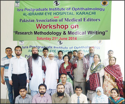 KARACHI: Pakistan Association of Medical Editors in collaboration with Eastern Mediterranean Association of Medical Editors (EMAME) organized a day long workshop on Medical Writing and Research Methodology at Isra Postgraduate Institute of Ophthalmology in Ibrahim Eye Hospital, Memon Goth, and Karachi on Saturday June 21st 2014. The workshop was attended by about forty participants and the facilitators included Dr. Fatema Jawad, Mr. Shaukat Ali Jawaid, Prof. Sina Aziz, and Dr.Mohammad Mubeen. Vice Chancellor of Isra University Prof. Ghulam Qadir Kazi, Pro Vice Chancellor Prof. Umar Ali Khan and Prof. Saleh Memon from Isra Postgraduate Institute of Opthalmology, Prof. Seema Mumtaz, Prof. Kazi Shakoor was also present on this occasion. This was the first academic activity by PAME after the election of new Executive in April 2014 and the initiative was taken by President PAME Dr. Fatema Jawad.